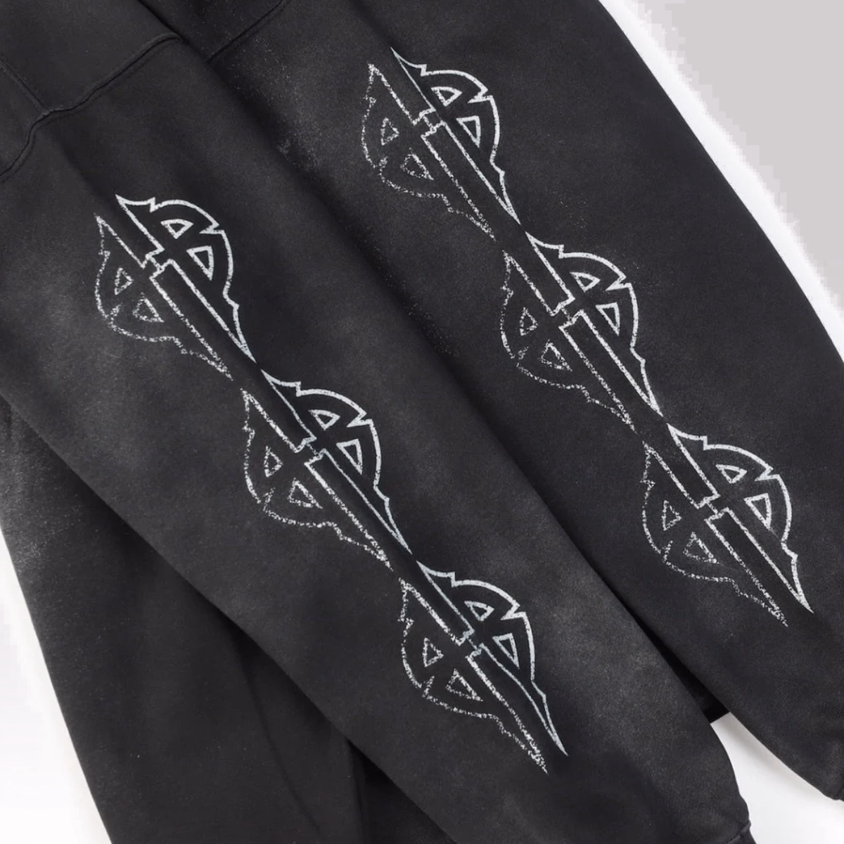 Crafted from cotton fleece, the hoodie delivers a soft feel with a slightly structured drape. What sets this piece apart is its intentionally faded and distressed finish, often featuring cracks, washes, and worn-out effects that give it a raw, vintage look.